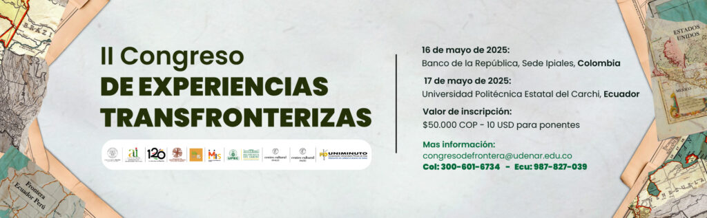 En el marco de nuestro compromiso con la reflexión académica sobre los procesos sociales y culturales en las fronteras, tenemos el honor de invitarle a participar en el II Congreso Internacional “Experiencias Transfronterizas”. Este evento, que se celebrará de manera presencial en las ciudades de Ipiales-Colombia (Banco de la República) y Tulcán-Ecuador (Universidad Politécnica Estatal del Carchi-UPEC) los días 16 y 17 de mayo de 2025, tiene como propósito presentar y generar procesos de reflexión e investigación sobre los sentidos, imaginarios y construcciones socioculturales en los contextos de frontera. A través de diversas mesas de trabajo, buscaremos indagar sobre los impactos sociales, políticos y culturales de las líneas limítrofes que ha marcado las relaciones entre países. En este congreso, se dará especial atención a los modos de vida, que han surgido en las poblaciones que comparten fronteras. Deseamos explorar las continuidades y rupturas que existen en la construcción de ciudadanías e identidades, en las experiencias educativas, los intercambios bioculturales, la sostenibilidad, los imaginarios del territorio, las movilidades humanas y las economías que atraviesan el límite. Los ejes transversales del II Congreso son: los Objetivos del Desarrollo Sostenible (ODS) y los avances en tecnologías emergentes.